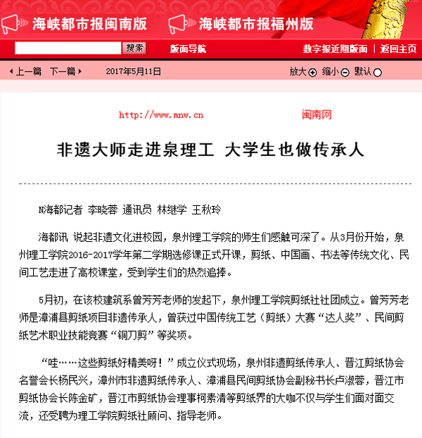 • 【海峡都市报】非遗大师走进泉理工 大学生也做传承人