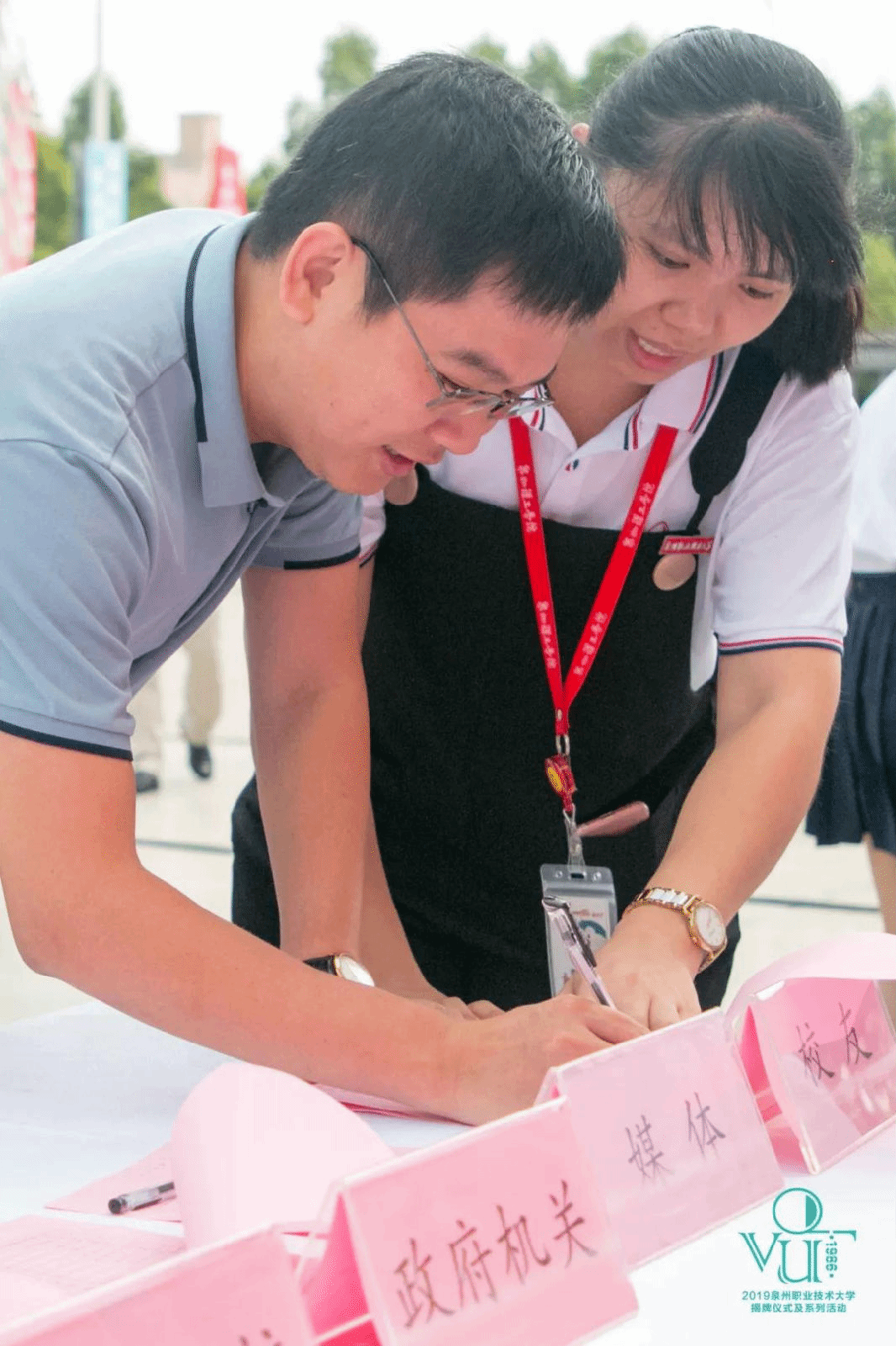 中国高等教育学科奠基人潘懋元教授、中国工程院胡永康院士、福建省教育厅发展规划处林海峰处长、泉州市人民政府周真平副市长、泉州市教育局黄世界局长、晋江市人民政府张文贤市长、吴金营董事长、臧树良校长为学校揭牌。