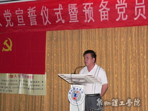 大会由校党政办刘兆麟主任主持。大会开始时,全体起立,奏《国际歌》。刘主任宣布了参加宣誓的新党员名单。我志愿加入中国共产党……”在吴滨如同志的领誓下,全体新党员面对鲜红的党旗立下庄严誓言。王莉莉、黄志兴分别代表教师和学生新党员发言表决心。