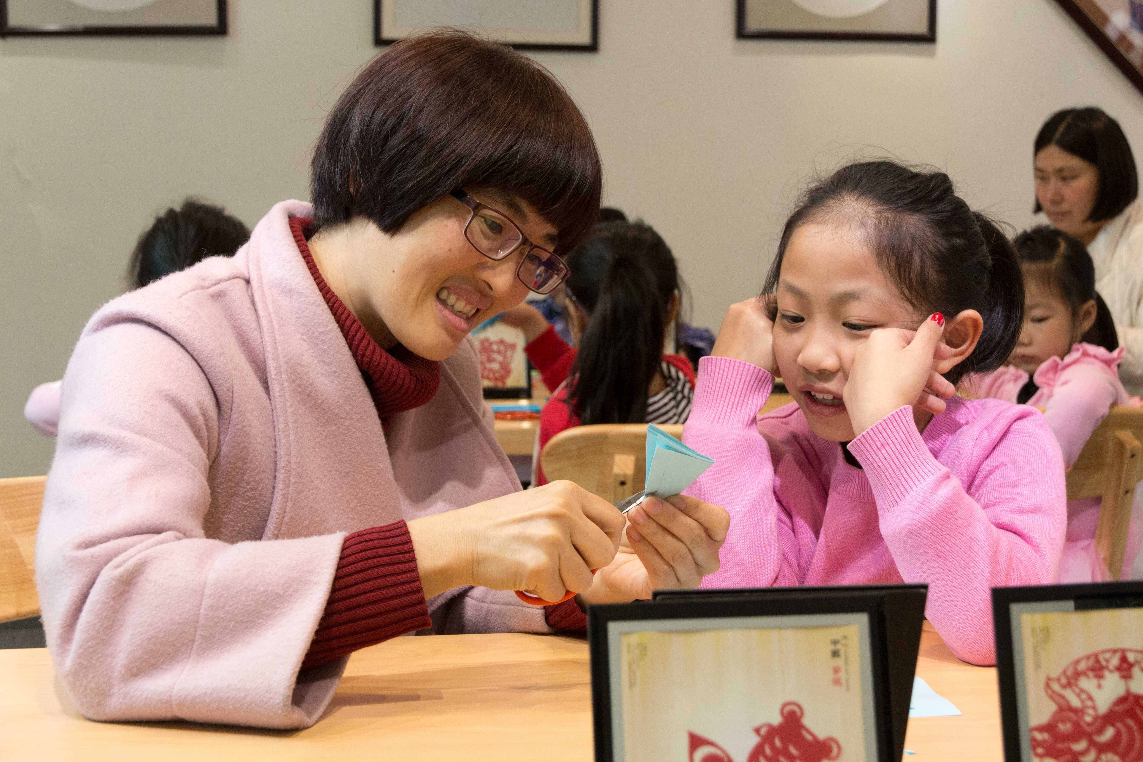 其实,曾芳芳学剪纸并非“童子功”,而是到2014年才“半路学艺”。而初衷,就是为了女儿。“2014年,大女儿许星岚4岁了,她喜欢手工,折纸玩布艺做彩泥,感觉蛮有天赋的。”曾芳芳希望多陪伴孩子,与孩子一起成长。于是萌发了和女儿一起学剪纸的念头。