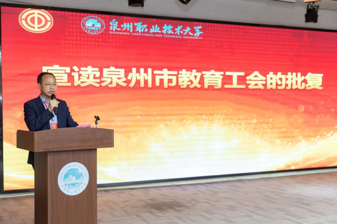▲ 党委副书记、副校长蔡金佩宣读泉州市教育工会贺信
