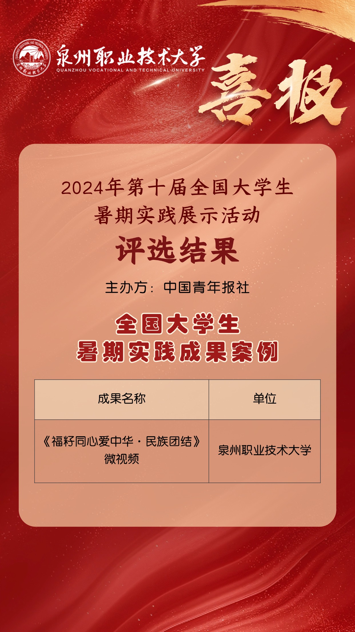 近日,由中国青年报主办的2024年第十届全国大学生暑期实践展示活动获奖名单发布。在清华大学、北京大学等全国各大高校共计4920支团队的激烈角逐中,泉州职业技术大学团委和三创书院组建的“福籽同心爱中华”铸牢中华民族共同体意识实践团的原创微视频《福籽同心爱中华·民族团结》入选“全国大学生暑期实践成果案例”。