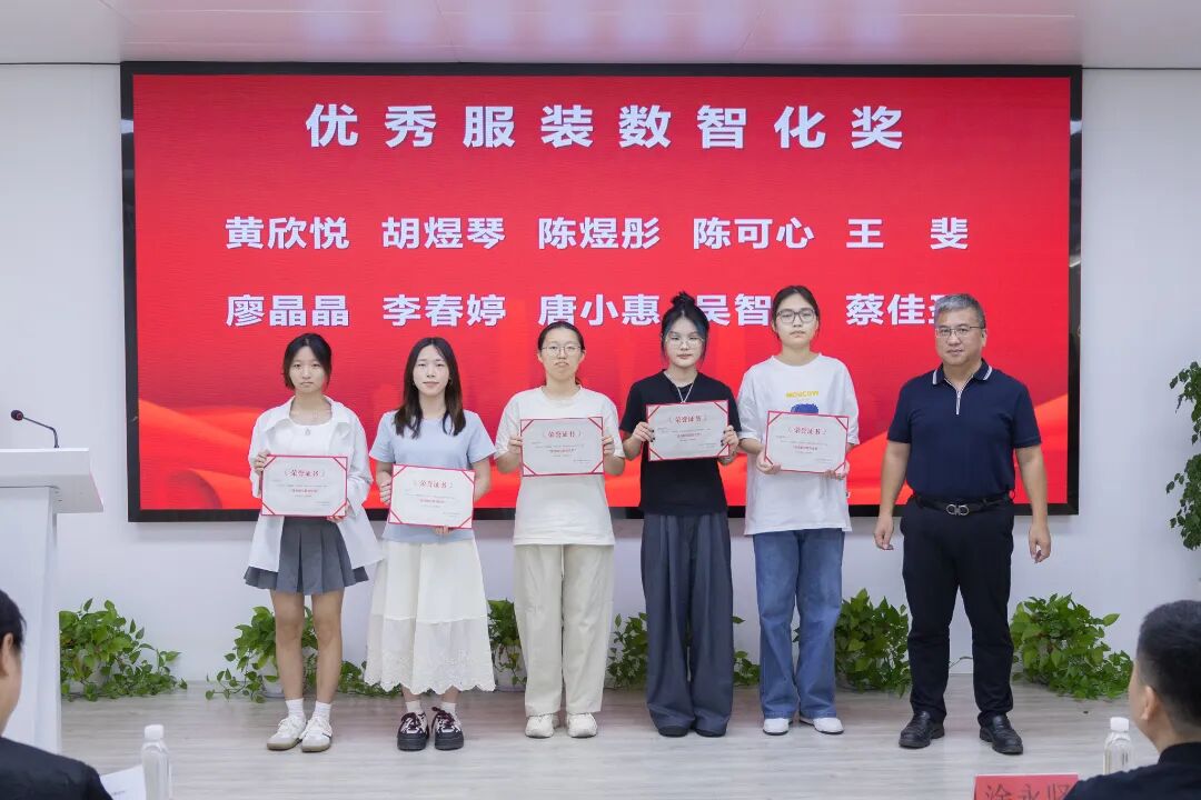 晋江号手服饰有限公司副总经理林荣俊为黄欣悦、胡煜琴、陈煜彤、陈可心、王斐、廖晶晶、李春婷、唐小惠、吴智明、蔡佳圣十位同学颁发“优秀服装数智化奖”,这一奖项是对同学们在服装数智化设计领域出色表现的肯定,彰显了他们的专业能力与创新素养。