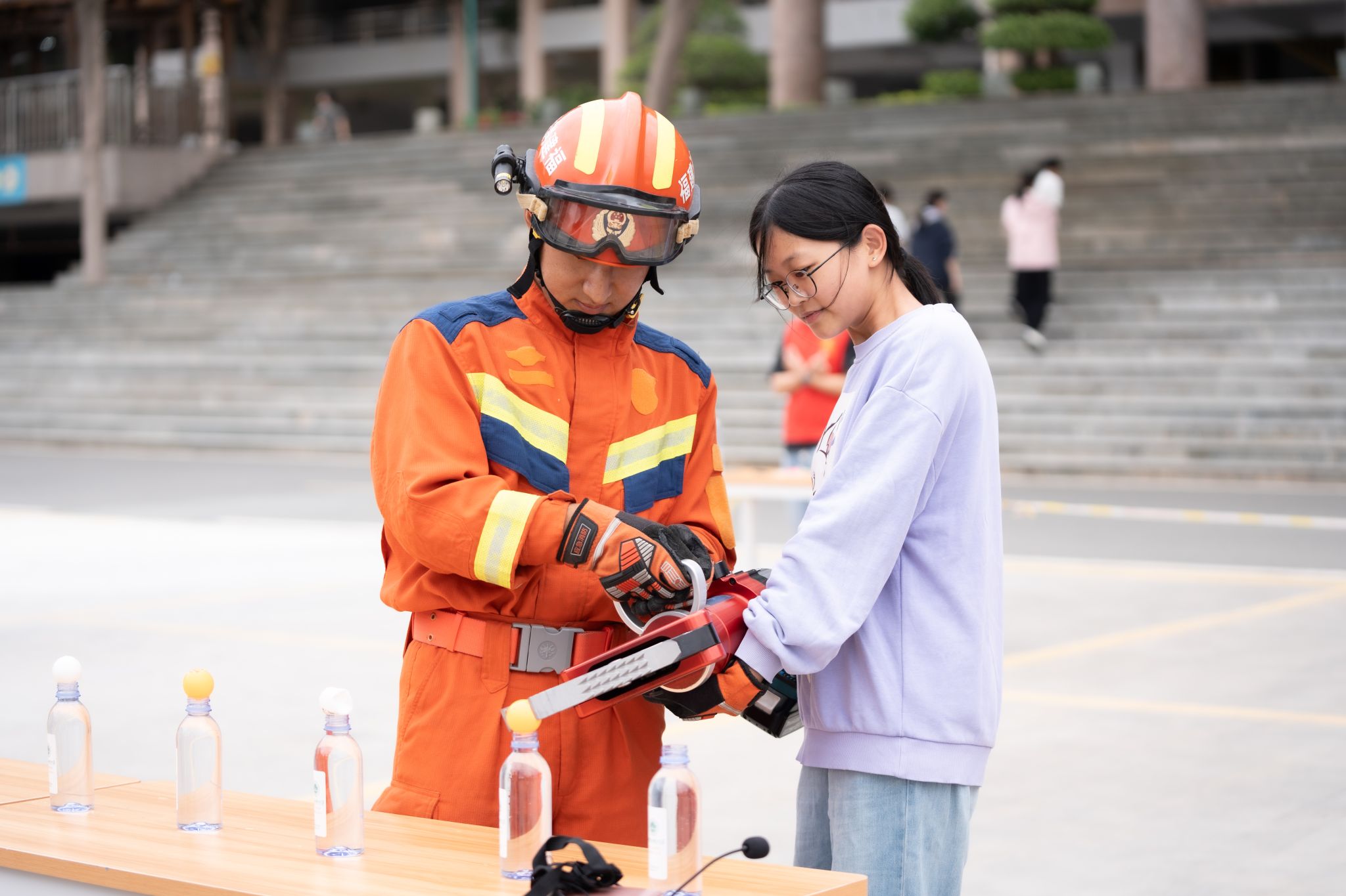 “以往只是听讲座,这次真的穿上消防服、操作扩张器夹乒乓球,才发现消防员的日常工作这么不容易!”现场体验的学生兴奋地表示。液压扩张器精准夹取乒乓球、救援艇快速水上施救、心肺复苏实操演练等七个特色项目轮番登场,让师生们从消防知识的“旁观者”变身安全技能的“掌握者”。