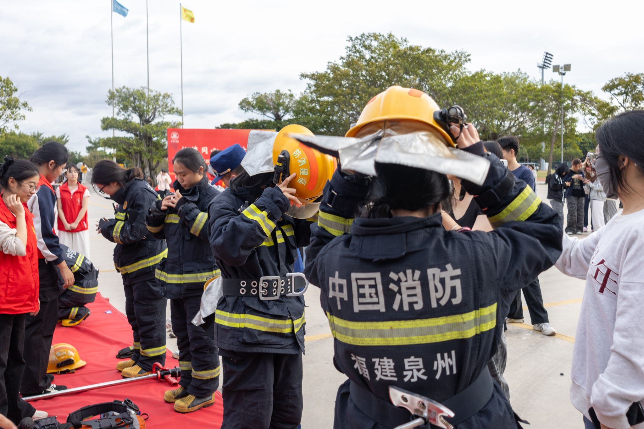 ▲ 同学们体验全套消防防护装备穿戴,并聆听专业人员讲解水枪装配和使用方式
