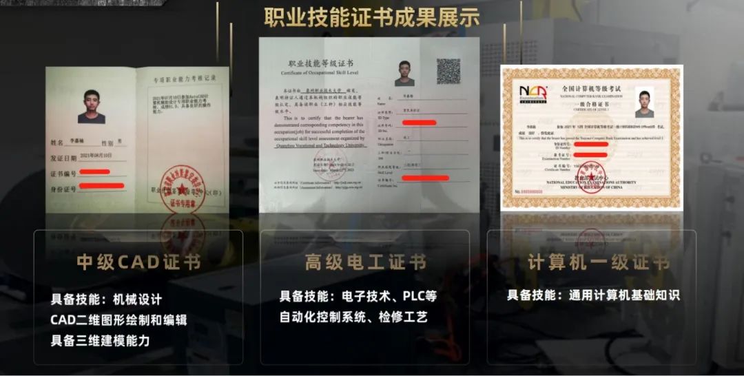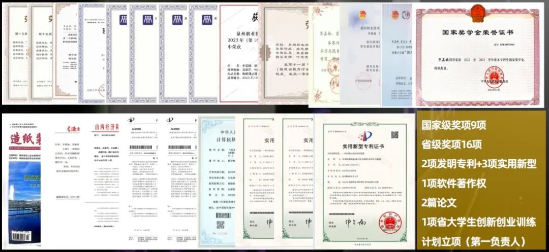 他在学习、实训与比赛之间马不停蹄,拿下了机械设计领域的中级CAD证书、高级电工证书,还获得9项国家级奖项、16项省级奖项、2项发明专利、3项实用新型专利、1项软件著作权、1项省大学生创新创业训练计划立项(第一负责人),并在学术期刊上发表了2篇专业论文。