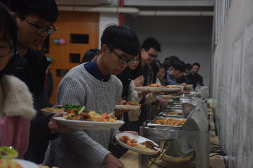 主席先以抢红包形式开场,来决定哪个部门先表演节目后,才能开饭。红包一出,气氛就热闹起来了。本次家宴最大的节目亮点是由新媒体中心、外联部、学习部联合带来了一场“international”的T台秀,引得台下爆笑连连。家宴上除了表演节目,还根据节目的质量设置了惩罚环节:饮料大比拼。不怕吃不饱,就怕喝不饱。