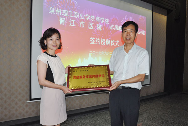 “老师是人类灵魂的工程师,医生是人类身心的医者,所以,泉州理工学院与晋江市医院携手合作,一定能把志愿服务做得更上一层楼。6月26日上午,泉州理工学院商学院与晋江市医院共建志愿服务实践基地签约授牌仪式在第一会议室隆重举行。晋江市医院党委黄东昭书记,晋江市医院詹曼艺副主任,晋江市医院黄芳菲女士,晋江市医院姚燕萍女士,泉州理工学院副校长庄文瑞老师,泉州理工学院校长助理,招生就业处处长蔡金佩老师,泉州理工学院学院商学院党总支书记陈荣惠老师,泉州理工学院商学院团总支书记罗永珍老师及商学院学生会16级学生干部出席本次会议。