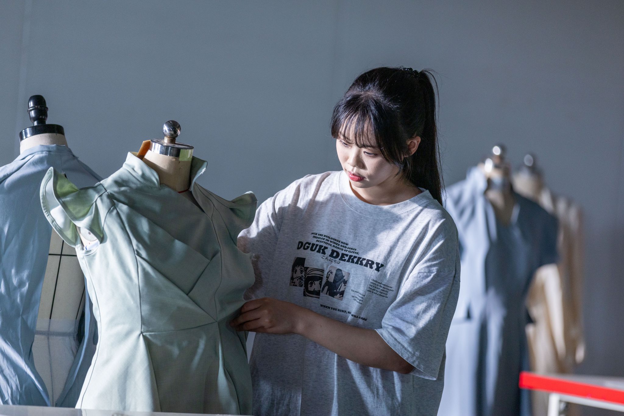 好不容易考上了服装与服饰设计专业,我的日常往往周而复始:画出电子或纸质设计稿,在巨大的打版纸上画出设计稿的裁剪轮廓,用轻薄的雪梨纸覆盖在上,复刻并裁剪下来,贴成衣服的样式,再穿到人台上,查验衣服细节。看似简单,但一个口袋尺寸、一个扣子位置稍微偏差,整个过程就要从打版开始重来一遍。一件衣服,改个十次八次是常有的事。好不容易打版过关了,车缝过程中歪了1毫米,我就要拆掉线再车一遍。老师笑称,你真是完美主义啊。我心想,好设计是改出来的,多改一遍,就能更好一点。